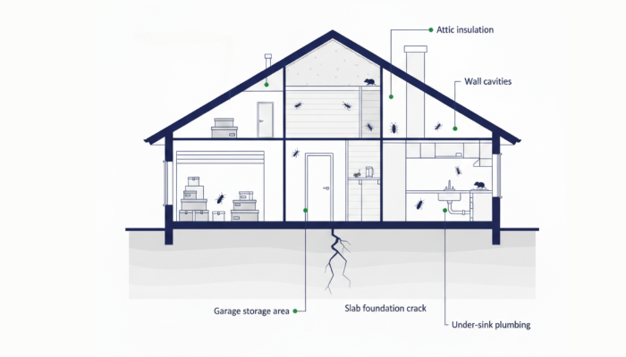 Pests most often hide inside wall cavities, attic insulation, under sinks, behind appliances, and along slab foundation cracks. These locations are dark, protected, and close to food or moisture.